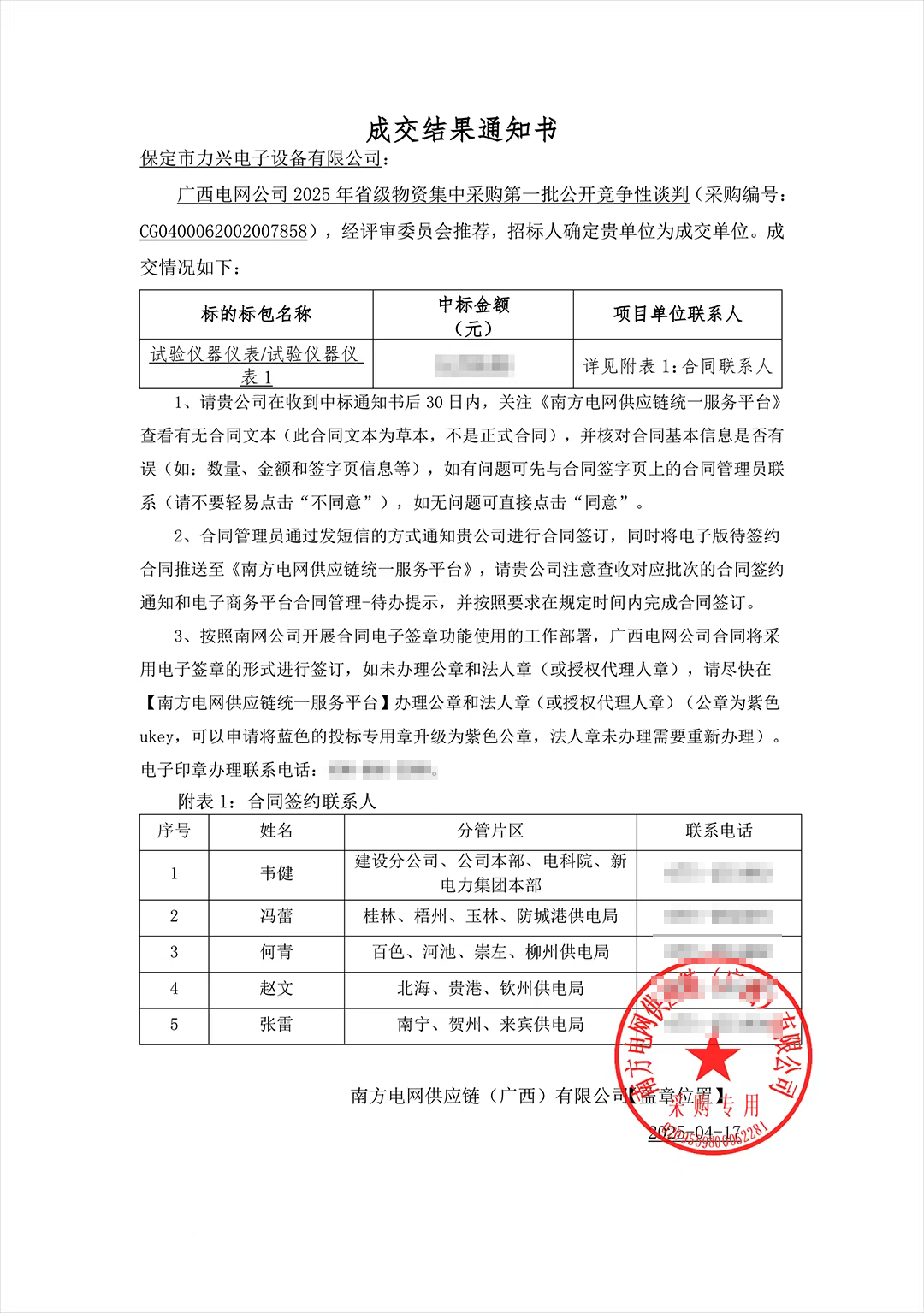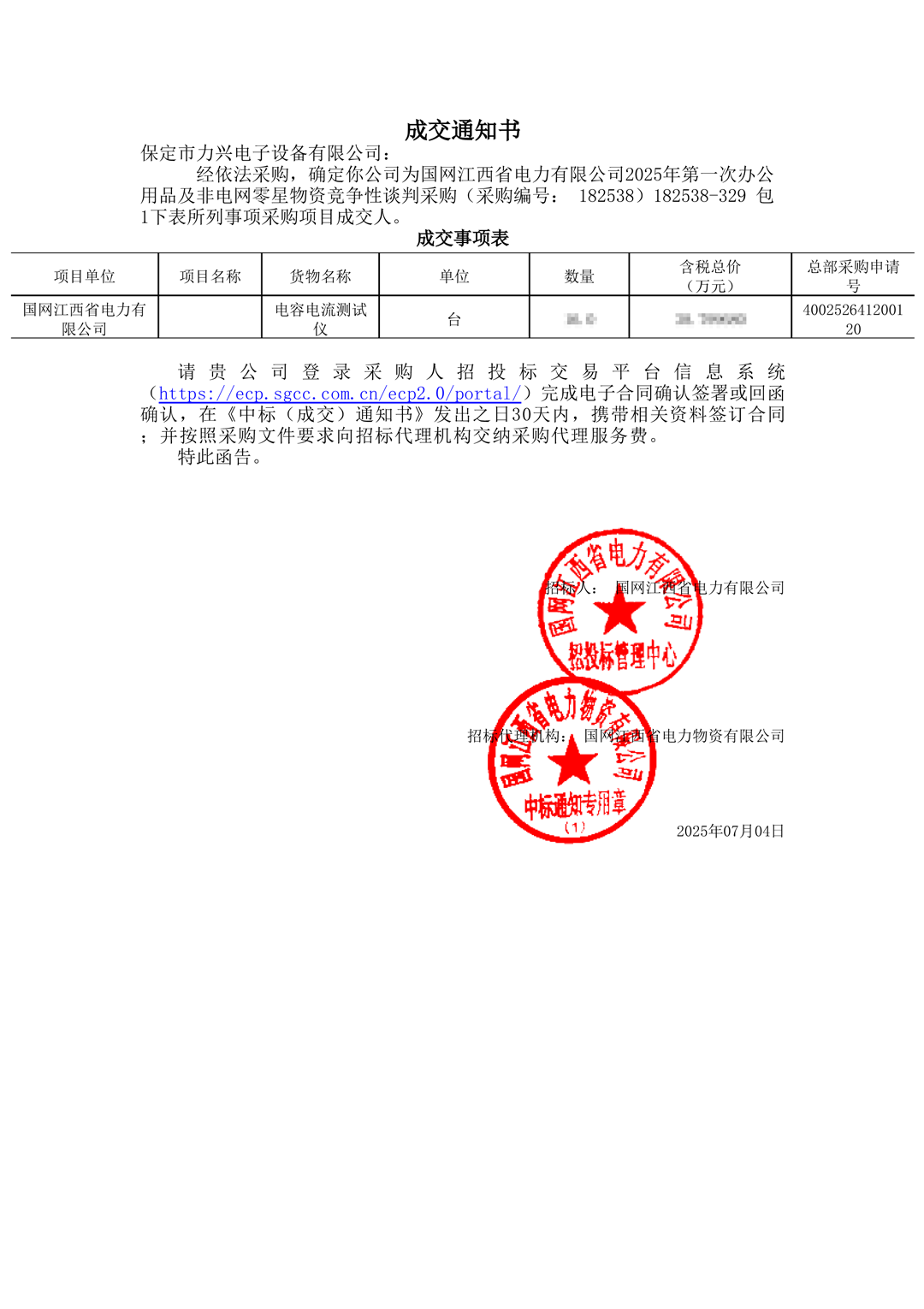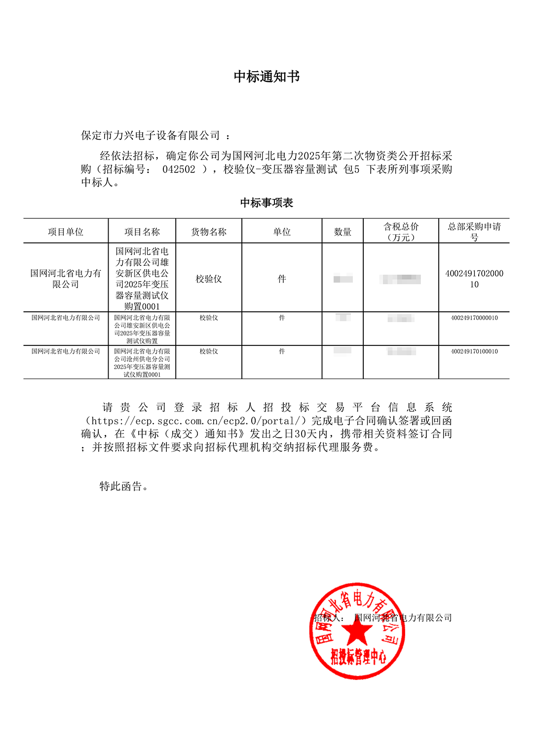 保定市力兴电子设备有限公司第二季度中标通知如下展示,我们将团结一致,再接再厉,迎接已经到来的第三季度。